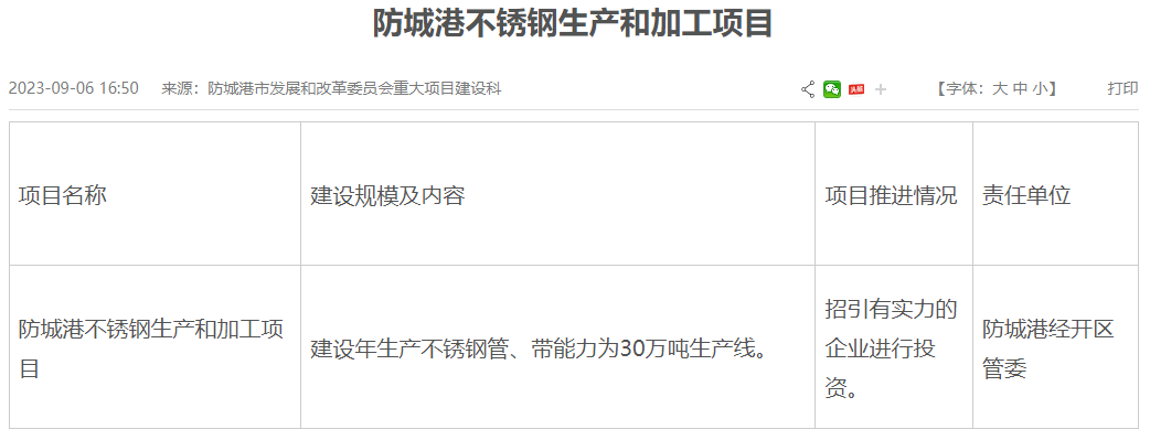廣西防城港不銹鋼生產(chǎn)和加工項目主要建設(shè)年生產(chǎn)不銹鋼管、帶能力為30萬噸生產(chǎn)線,目前項目處于招引有實力的企業(yè)進(jìn)行投資階段。