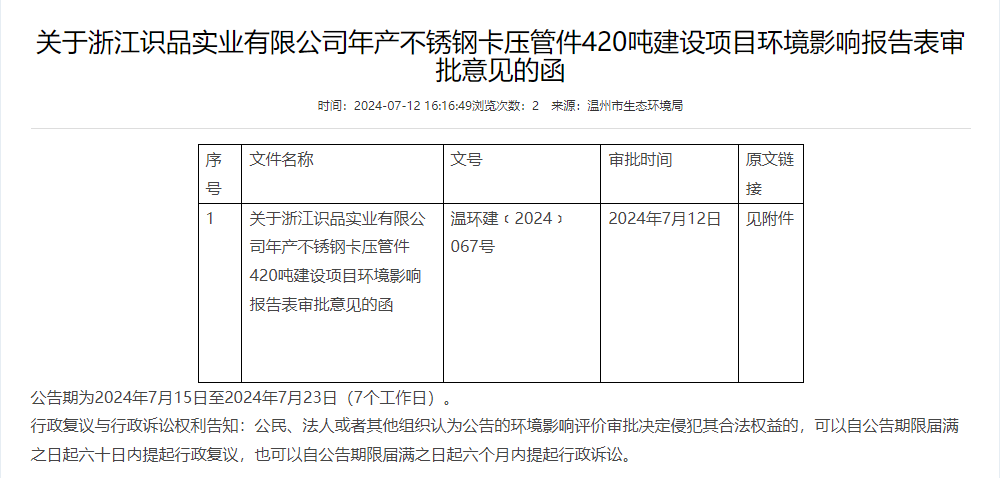 7月12日,溫州市生態環境局就浙江識品實業有限公司年產420噸不銹鋼卡壓管件建設項目環境影響報告表作出審批意見并對外進行公告,公告期為2024年7月15日至2024年7月23日(7個工作日)。